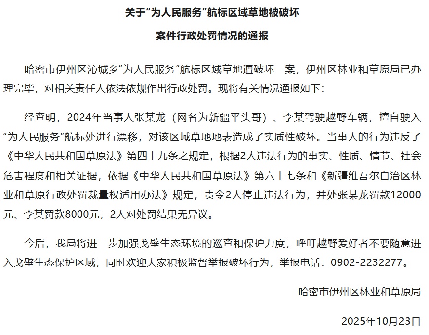10月23日,新疆哈密市伊州区林业和草原局发布对哈密市伊州区秦城乡“为民服务”航区草草损坏案行政处罚通知书。宜州区林业和草原局已查结此案,并依法依规对相关责任人给予行政处罚。现将相关情况通报如下:经查明,2024年,涉案当事人张某龙(网名新疆平头哥)、李某未经允许将车辆推离道路,在“为人民服务”导航标志上漂流,对辖区草地造成较大破坏。当事人的行为违反了《中华人民共和国草原法》第四十九条的规定。根据事实、性质、情节、对社会的损害程度以及相关证据对二人的违法行为,根据《中华人民共和国草原法》第六十七条和《新疆维吾尔自治区林业草原行政处罚适用自由裁量权的建议》,责令二人停止违法行为,对甲人处以12000元罚款,对李某处罚款8000元。两人对判罚结果并无异议。今后我局将进一步加强对戈壁生态环境的排查和保护,并呼吁越野爱好者不要随意进入戈壁生态保护区。同时,欢迎大家积极监督、举报破坏行为。举报热线:0902-2232277。